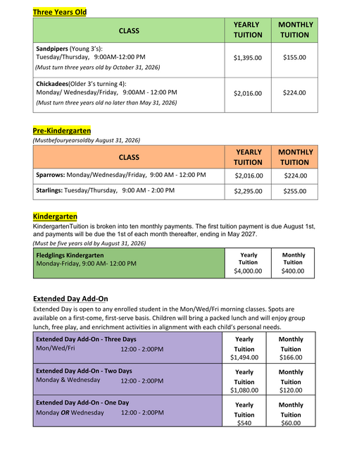 Note: There is a sibling discount of 15% applied to students who already have a sibling enrolled at The Nest.